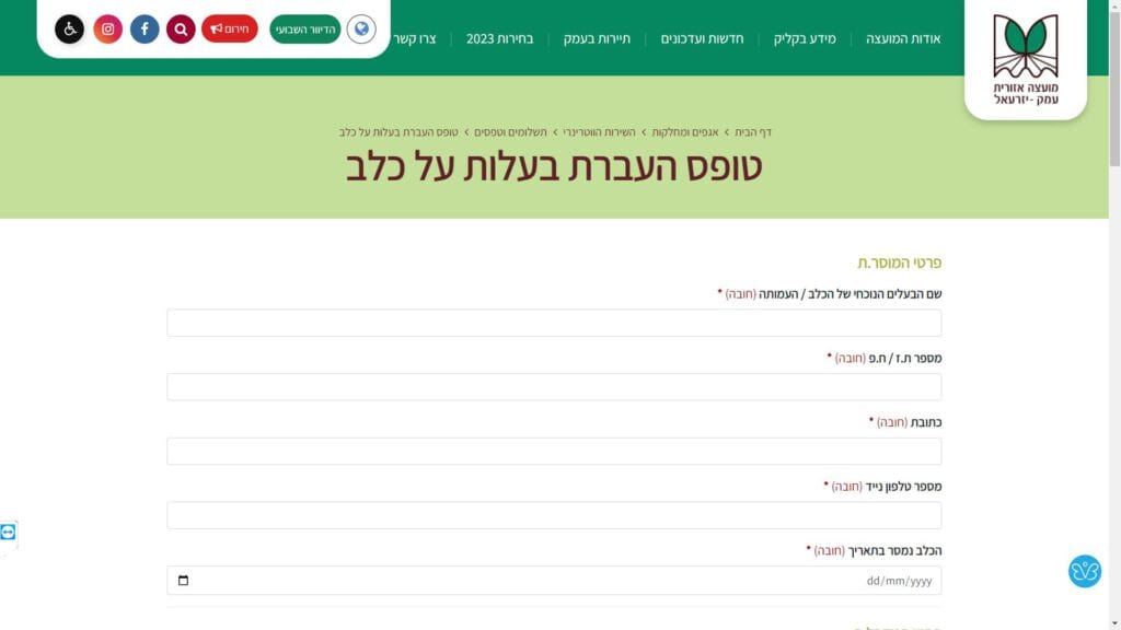 צילום מסך טופס להעברת בעלות על כלב טופס מקוון