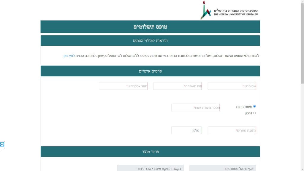 טופס קל » מוסדות לימוד » האוניברסיטה העברית בירושלים » האגף למינהל סטודנטים » טופס לתשלום עבור אישורי שכר לימוד לשנים קודמות (ניתן להוציא אישורים ללא תשלום על השנה הנוכחית במידע האישי)