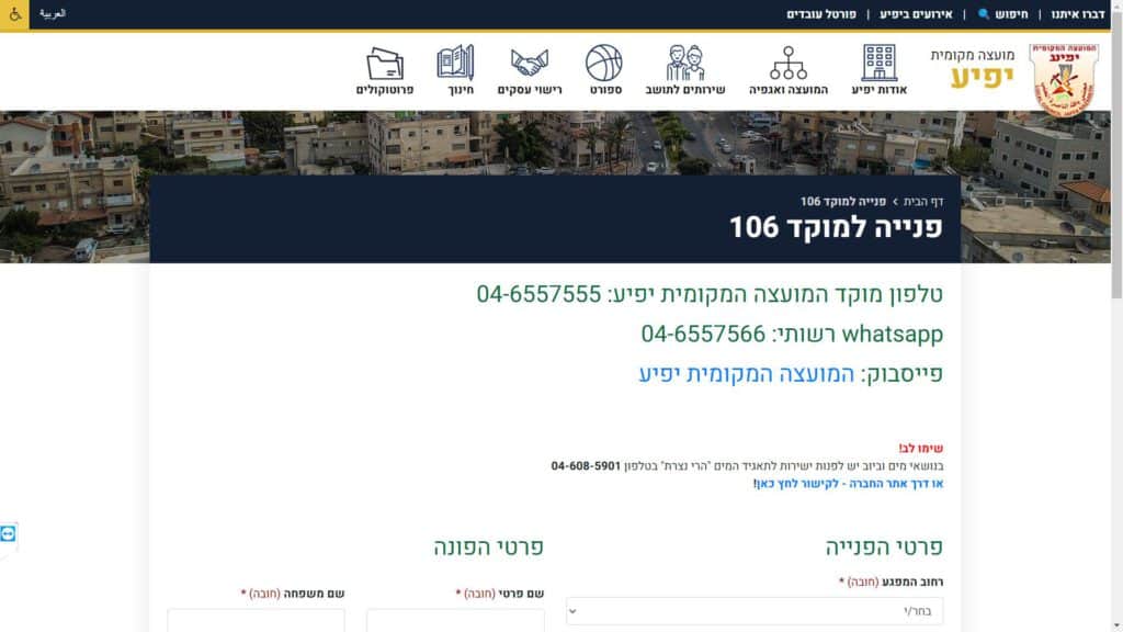 צילום מסך טופס מוקד עירוני - 106 טופס מקוון