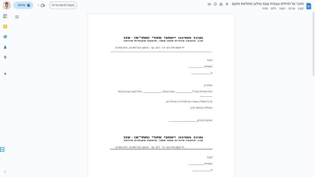 צילום מסך טופס מזכר על תחילת עבודה של גננת השילוב טופס מקוון