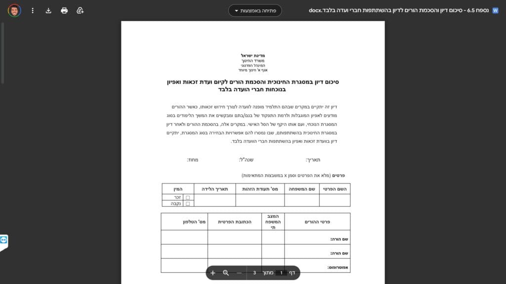 טופס קל » חינוך » מתי"א עפולה » עבודה שוטפת עם תלמידים » טופס נספח 65 סיכום דיון והסכמת הורים לקיום דיון ללא הורים