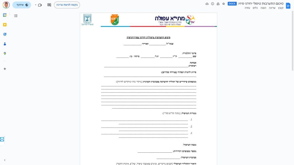 טופס סיכום התערבות טיפולי יחידני פיזיו חלופה נגישה - כרגע לא קיימת.