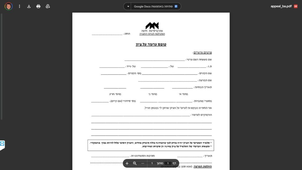 טופס ערעור על ציון להורדה והדפסה - כרגע לא קיים טופס PDF.