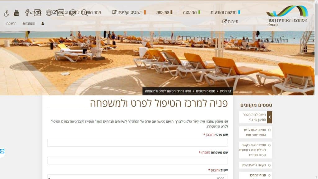 טופס קל » עיריות » עיריות בדרום » מועצה אזורית תמר » שירותים חברתיים » טופס פניה למרכז הטיפול לפרט ולמשפחה