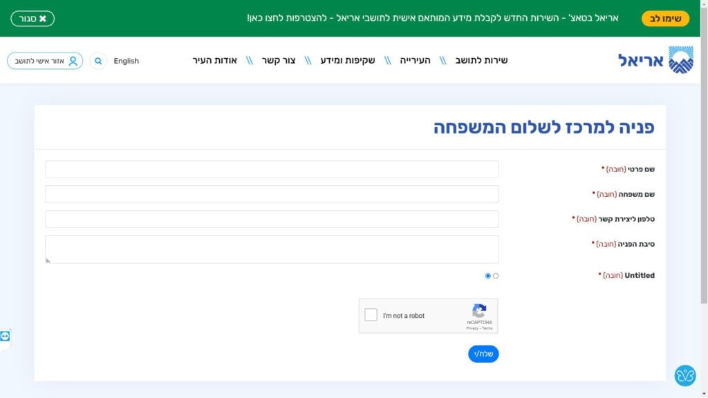 צילום מסך טופס פניה למרכז לשלום המשפחה טופס מקוון