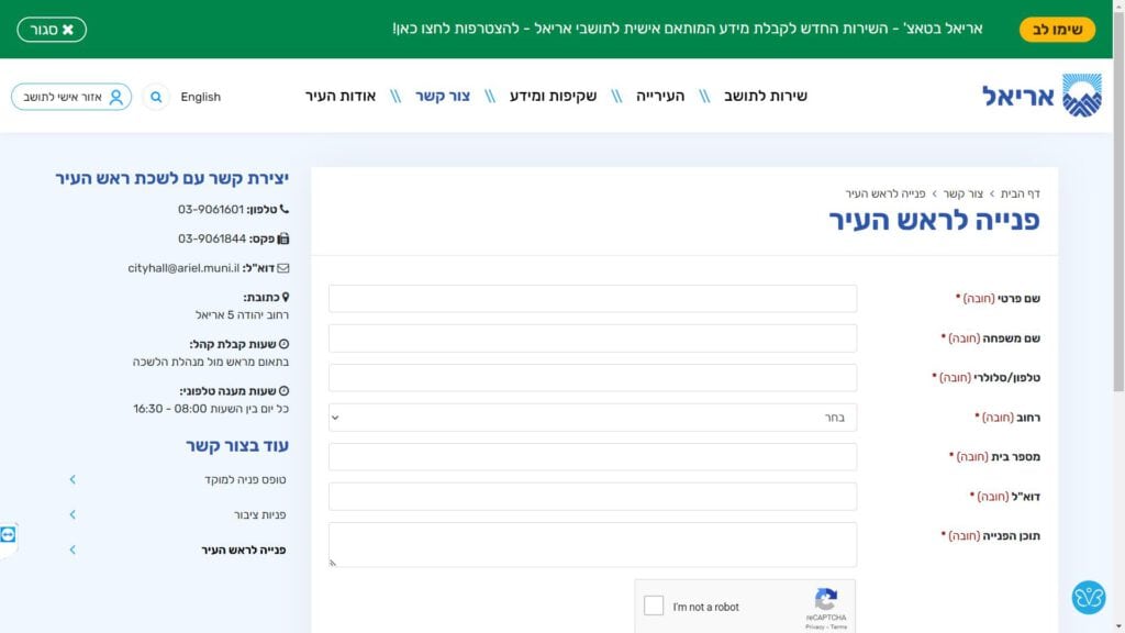 צילום מסך טופס פנייה ישירה לראש העיר טופס מקוון