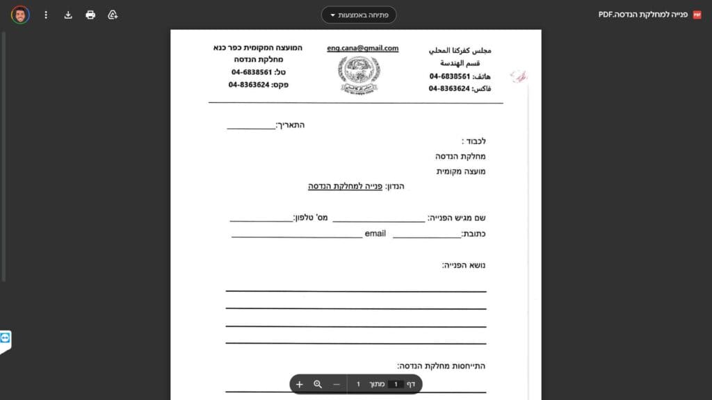 טופס פנייה למחלקת הנדסה להורדה, הדפסה ומילוי מקוון