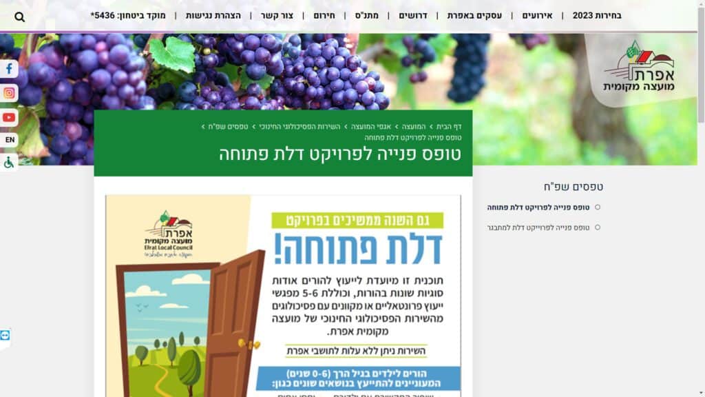 טופס קל » עיריות » עיריות בירושלים והסביבה » מועצה מקומית אפרת » טופס פנייה לפרויקט דלת פתוחה