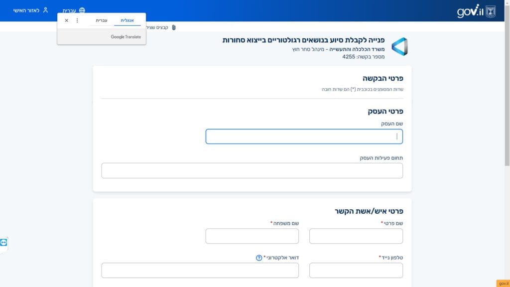 צילום מסך טופס פנייה לקבלת מידע וסיוע בפתרון קשיים רגולטורים או חסמי סחר במדינת היעד אליה מייצאים טופס מקוון