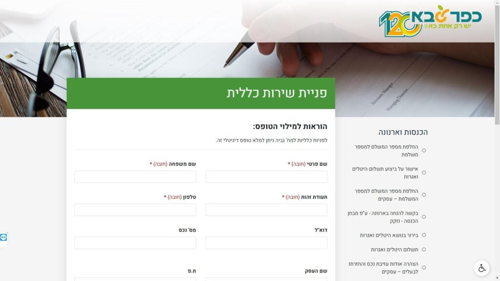 צילום מסך טופס פניית שירות כללית טופס מקוון