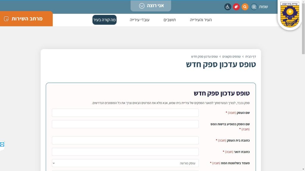 טופס קל » עיריות » עיריות בשפלה » עיריית בית שמש » רכש » טופס פתיחת ספק חדש