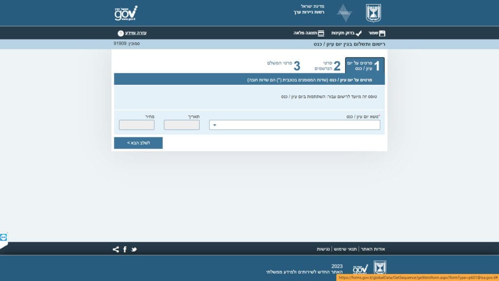 צילום מסך טופס פ601 - רישום ותשלום בגין יום עיון טופס מקוון