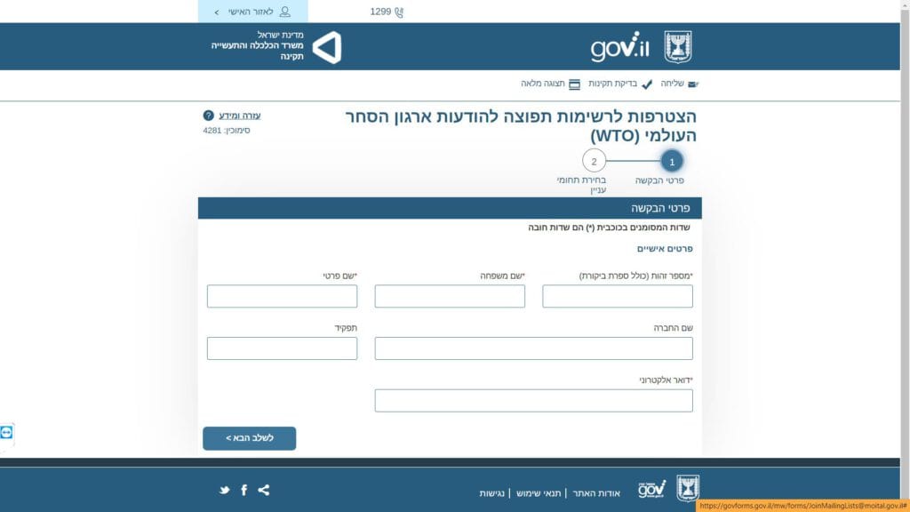 צילום מסך טופס קבלת מידע על שינויים בחקיקה טכנית במדינות החברות בארגון הסחר העולמי טופס מקוון