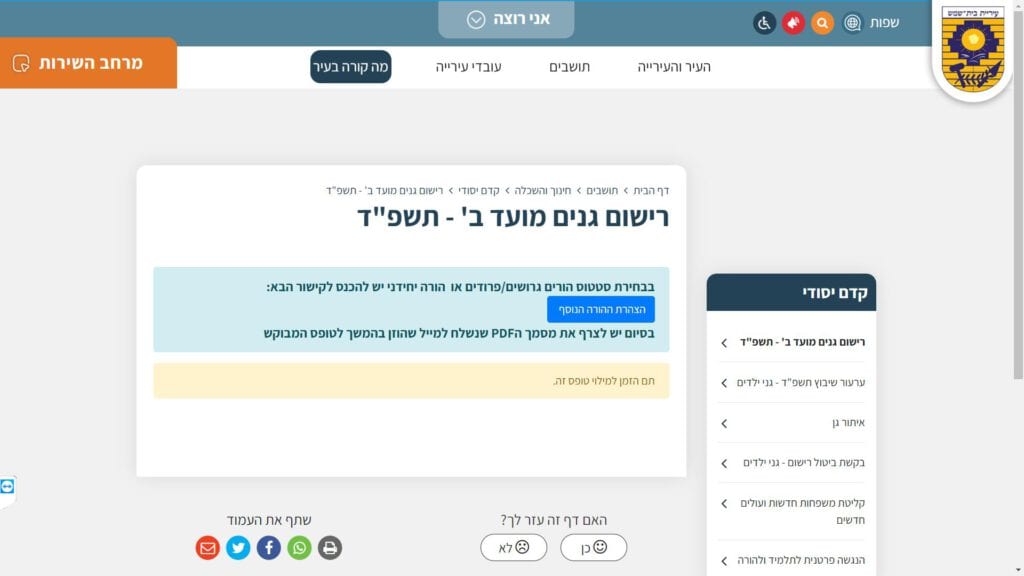 טופס קל » עיריות » עיריות בשפלה » עיריית בית שמש » חינוך » טופס רישום גנים מועד ב' – תשפ"ד