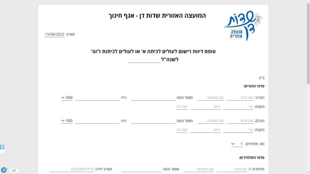צילום מסך טופס רישום לחינוך טופס מקוון