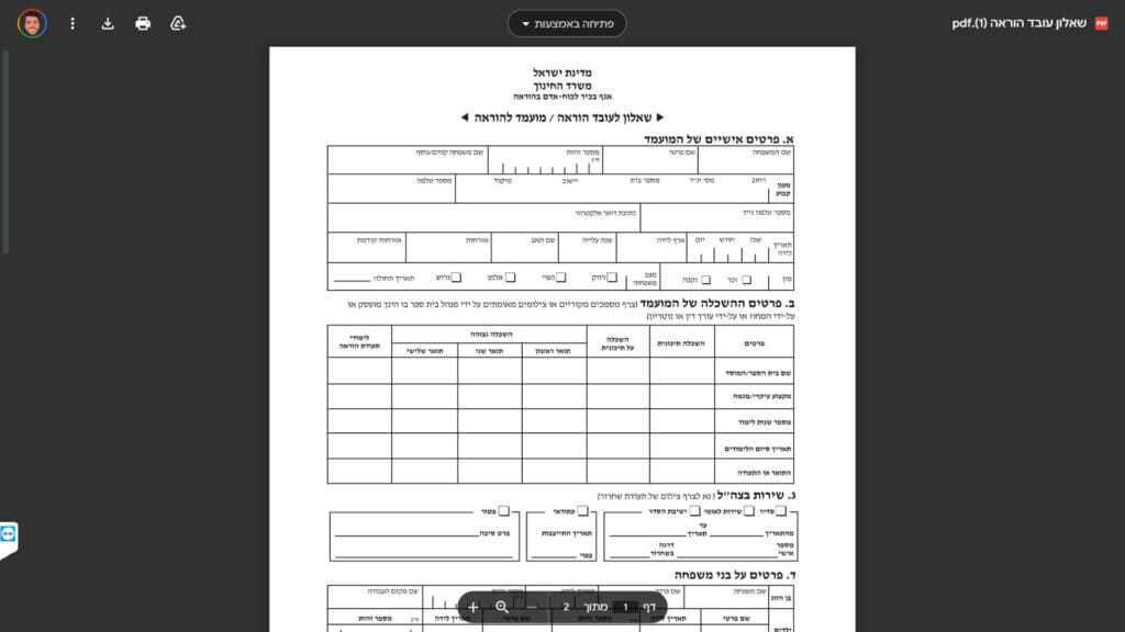 בתחילת המדריך צירפנו עבורך קישור להורדת טופס שאלון עובד הוראה. יש ללחוץ על הכפתור ואתה תעבור להורדת הטופס. במידה והינך גולש ממכשיר סלולרי או אייפון לדוגמא שלא מתחיל את ההורדה בצורה מיידית, תוכל לגלול מטה במאמר אל הטופס לצפייה ישירה ולהוריד אותו משם אל המכשיר.