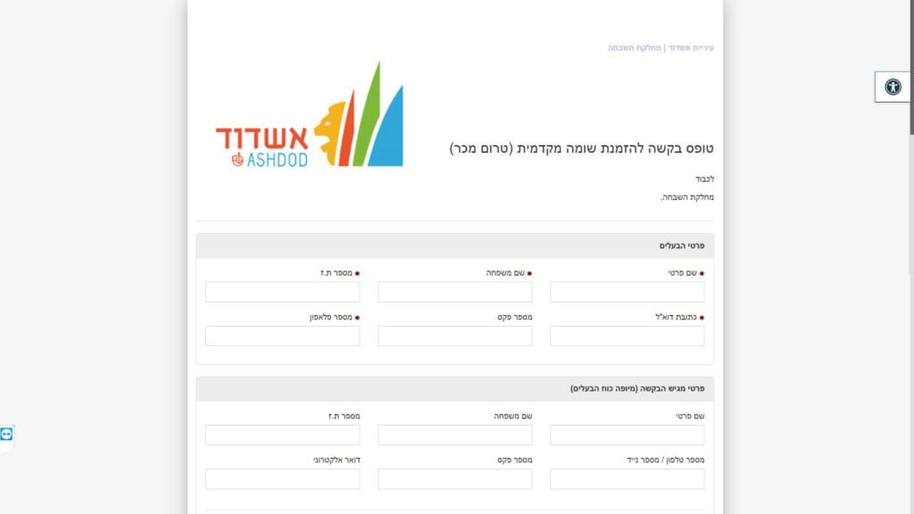 טופס קל » עיריות » עיריות בדרום » עיריית אשדוד » השבחה » טופס שירות מקוון להזמנת שומה מקדמית (טרום מכר)