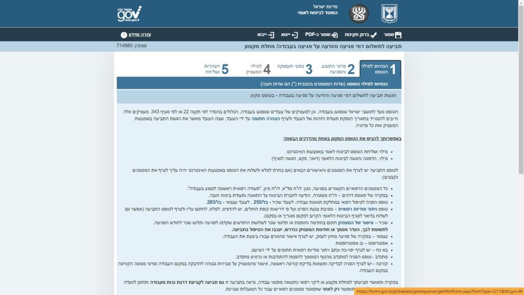 צילום מסך טופס תביעה להכרה במחלת מקצוע או ליקוי רפואי כתוצאה מתנאי עבודה (202) טופס מקוון