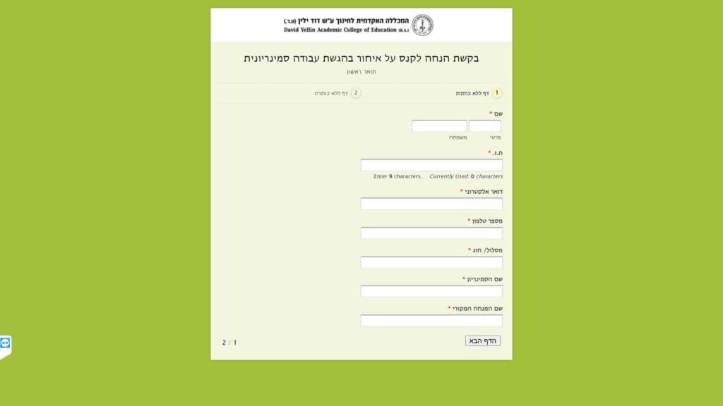 טופס קל » מוסדות לימוד » המכללה האקדמית לחינוך ע"ש דוד ילין » עבודות סמינריוניות » טופס תואר ראשון – טופס בקשת הנחה להגשת עבודה סמינריונית באיחור
