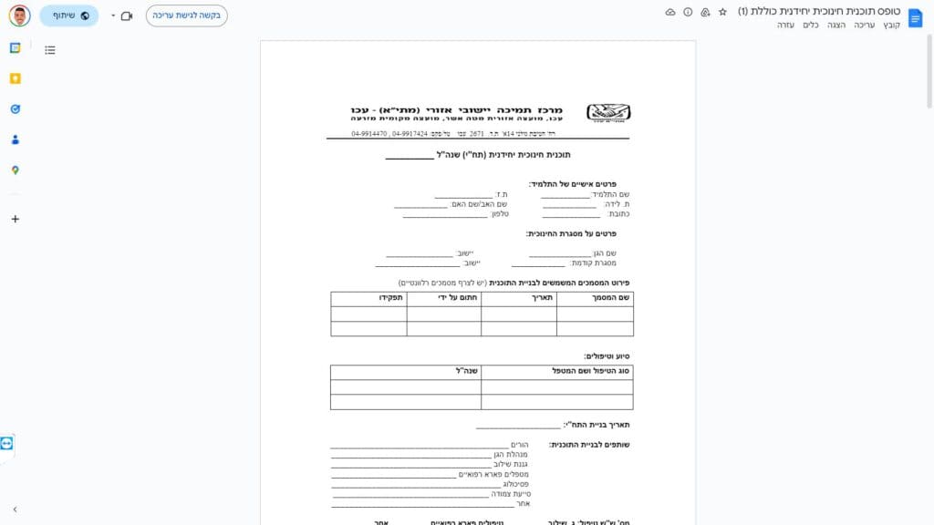 צילום מסך טופס תוכנית חינוכית יחידנית כוללת טופס מקוון