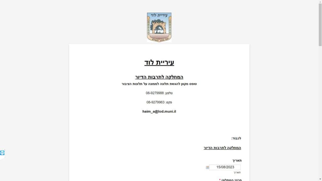 טופס קל » עיריות » עיריות בשרון » עיריית לוד » כללי » טופס תלונה המחלקה לתרבות הדיור