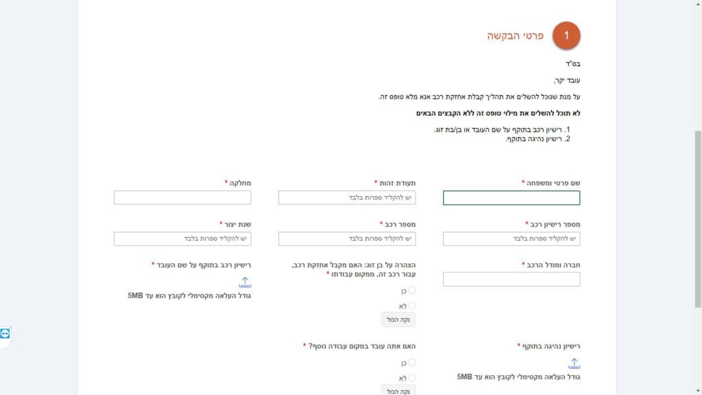 צילום מסך טופס תצהיר פרטי רכב טופס מקוון