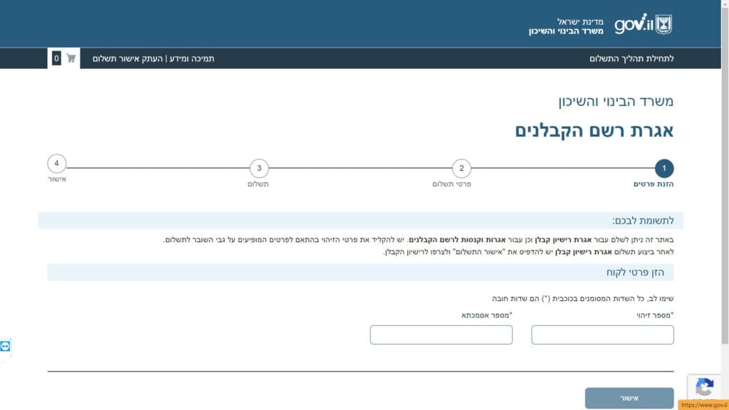 צילום מסך טופס תשלום אגרה עבור רישום בפנקס הקבלנים ועבור רישיון קבלן טופס מקוון