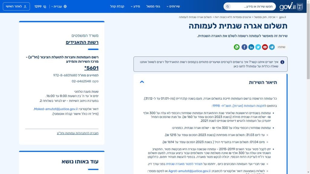גוף שיתמוך בשאלות על טופס תשלום אגרה שנתית לעמותה