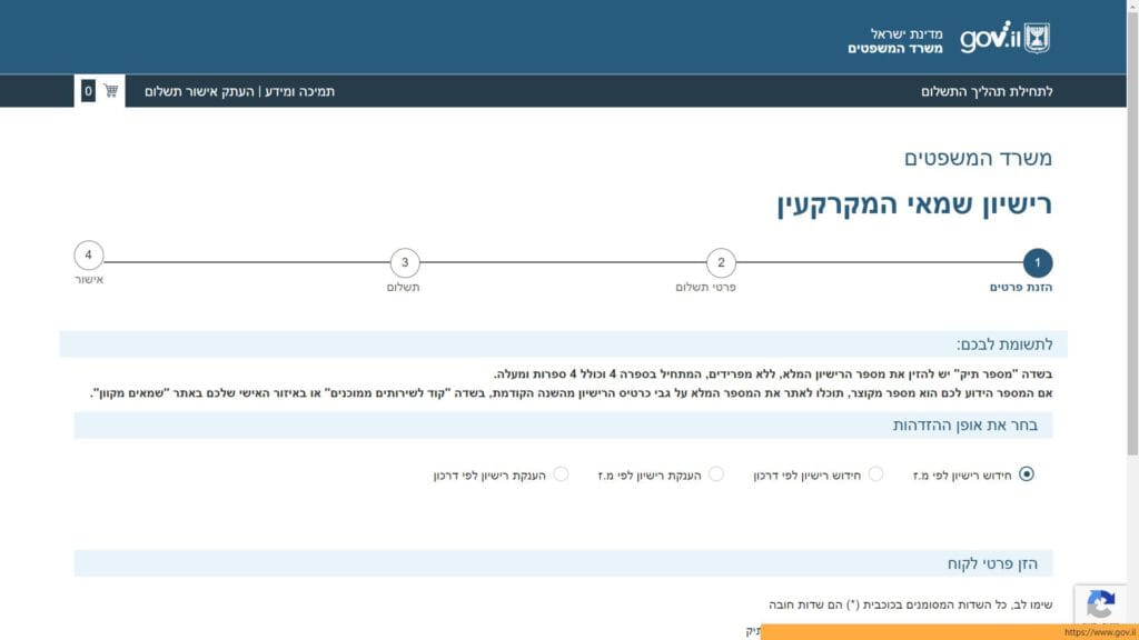 צילום מסך טופס תשלום אגרה תקופתית לשמאים הרשומים בפנקס שמאי המקרקעין - חידוש רישיון שנתי טופס מקוון