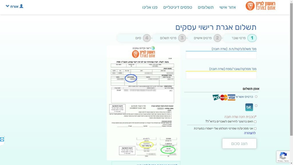 צילום מסך טופס תשלום אגרת רישוי עסקים​ טופס מקוון
