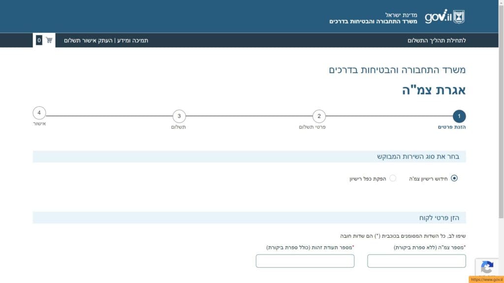 צילום מסך טופס תשלום אגרת רישיון ציוד מכני הנדסי (צמ"ה) טופס מקוון