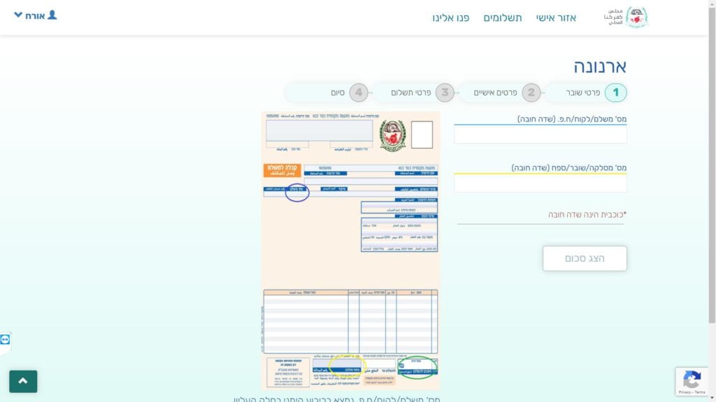 צילום מסך טופס תשלום ארנונה מקוון טופס מקוון