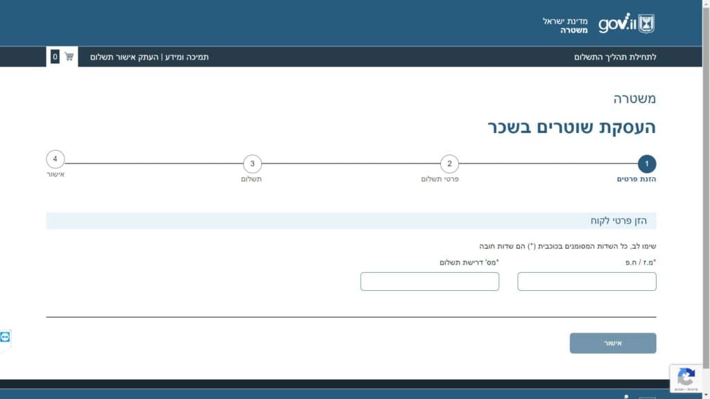 צילום מסך טופס תשלום על העסקת שוטרים טופס מקוון