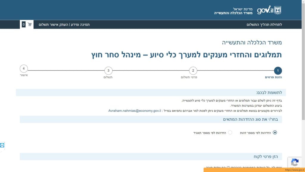 צילום מסך טופס תשלום תמלוגים והחזרי מענקים במסגרת תוכניות מערך כלי הסיוע של סחר חוץ טופס מקוון
