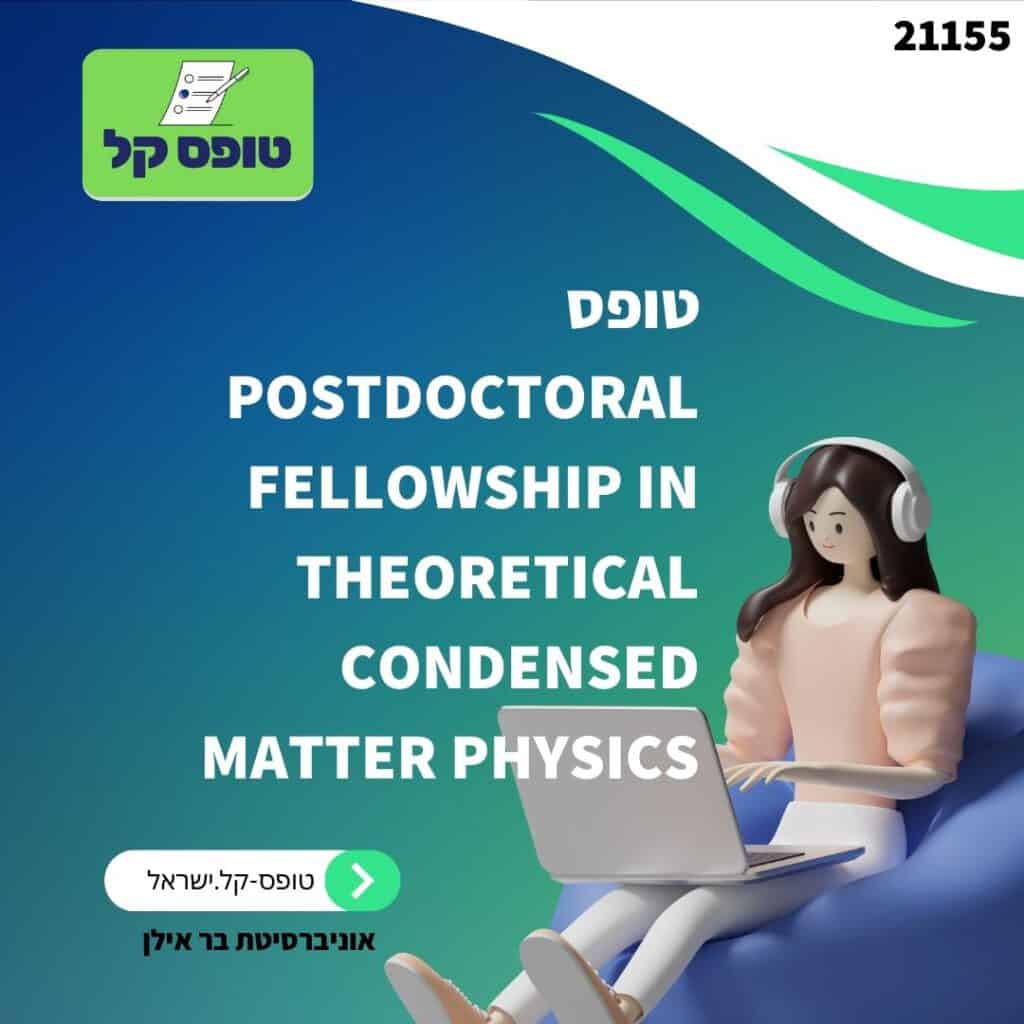 הטופס "Postdoctoral fellowship in theoretical condensed matter physics" מאוניברסיטת בר-אילן - המחלקה לפיזיקה, מספק הזדמנות לבחירת בעל תואר דוקטורט בפיזיקה לבצע מחקר עצמאי בתחום הפיזיקה התיאורטית של חומר רכה מרוכז. המועמד המוצלח יידרש לבצע מחקר בשותפות עם חברי צוות הפיזיקה התיאורטית הרכוכים: פרופסור ריצ'רד ברקוביץ', פרופסור אמנואלה דאלה טורה, פרופסור דמיטרי גוטמן, ד"ר ג'ונתן רוהמן ופרופסור אפרת שמשוני.